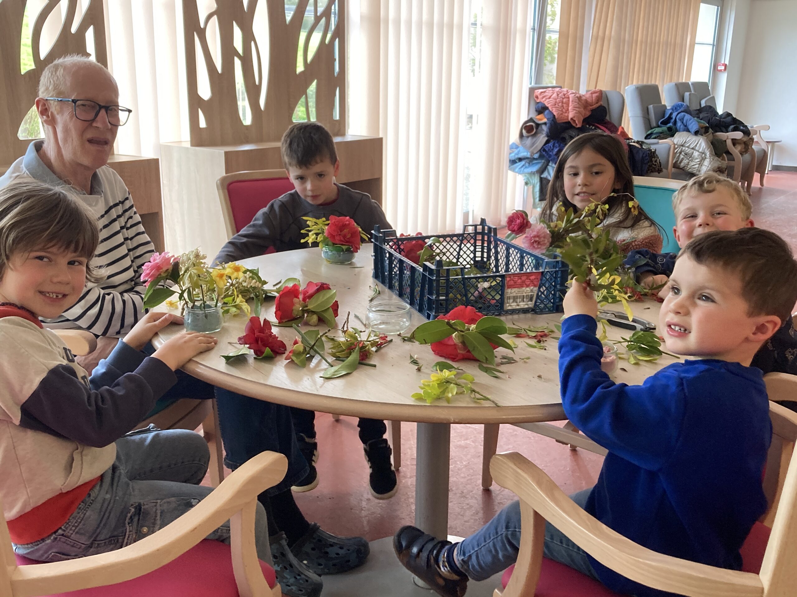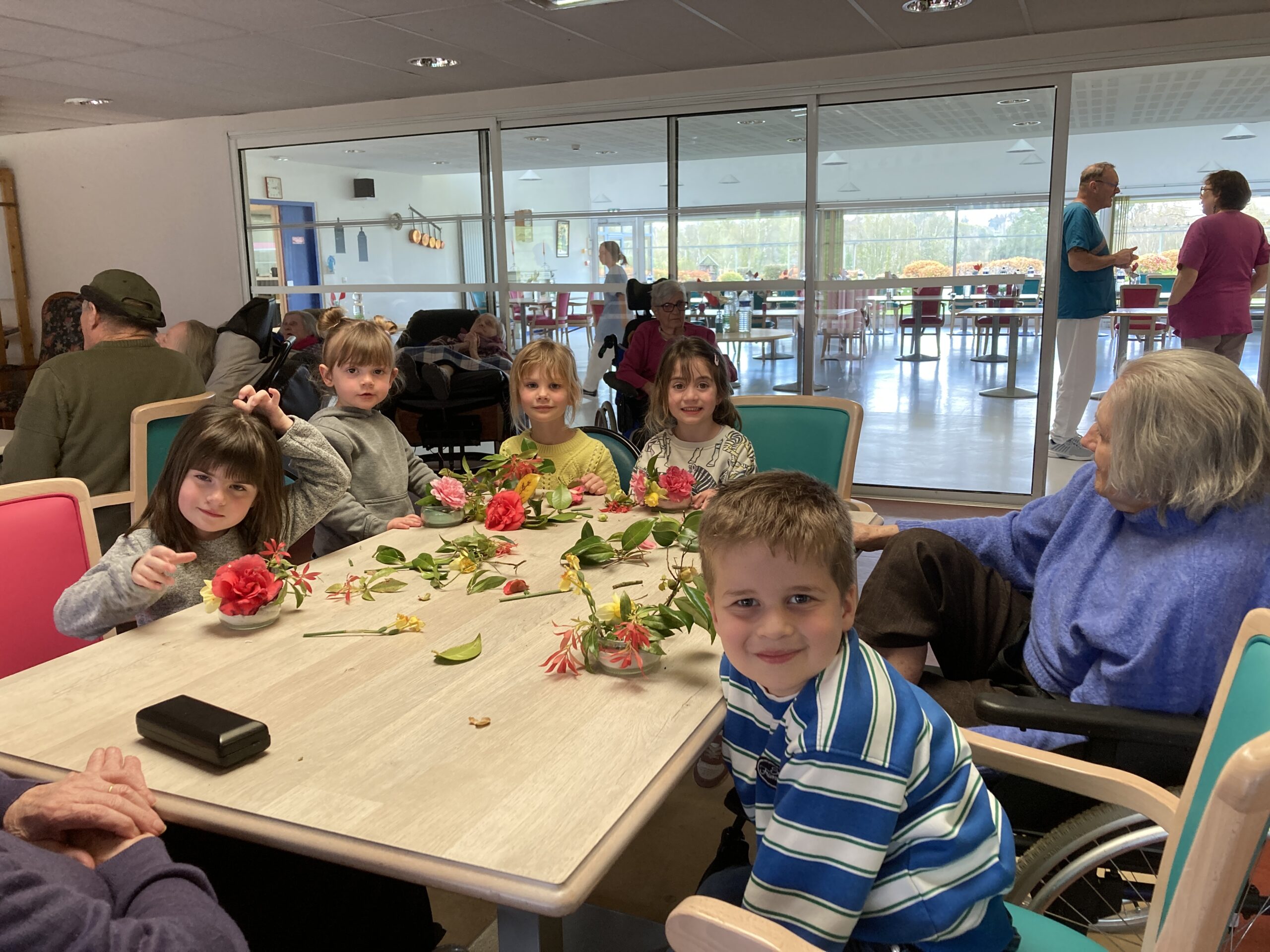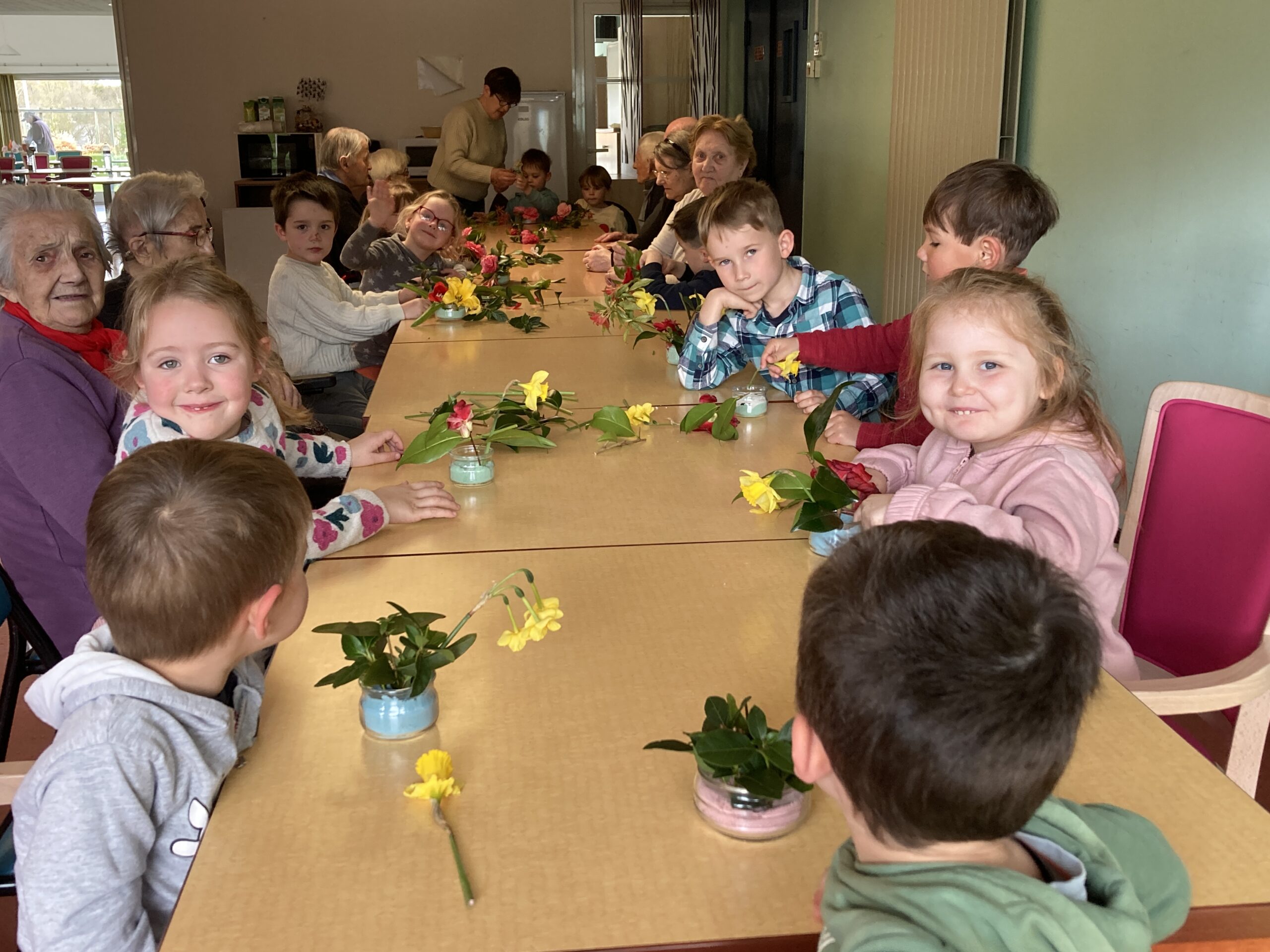 Les enfants de maternelle ont passé un temps à la maison de retraite le jeudi 26 mars dans le cadre du projet intergénérationnel. Un atelier art floral a permis aux enfants de créer du lien avec les personnes de la maison de retraite. Les compositions florales étaient déposées sur les tables pour le repas de la langue de boeuf.