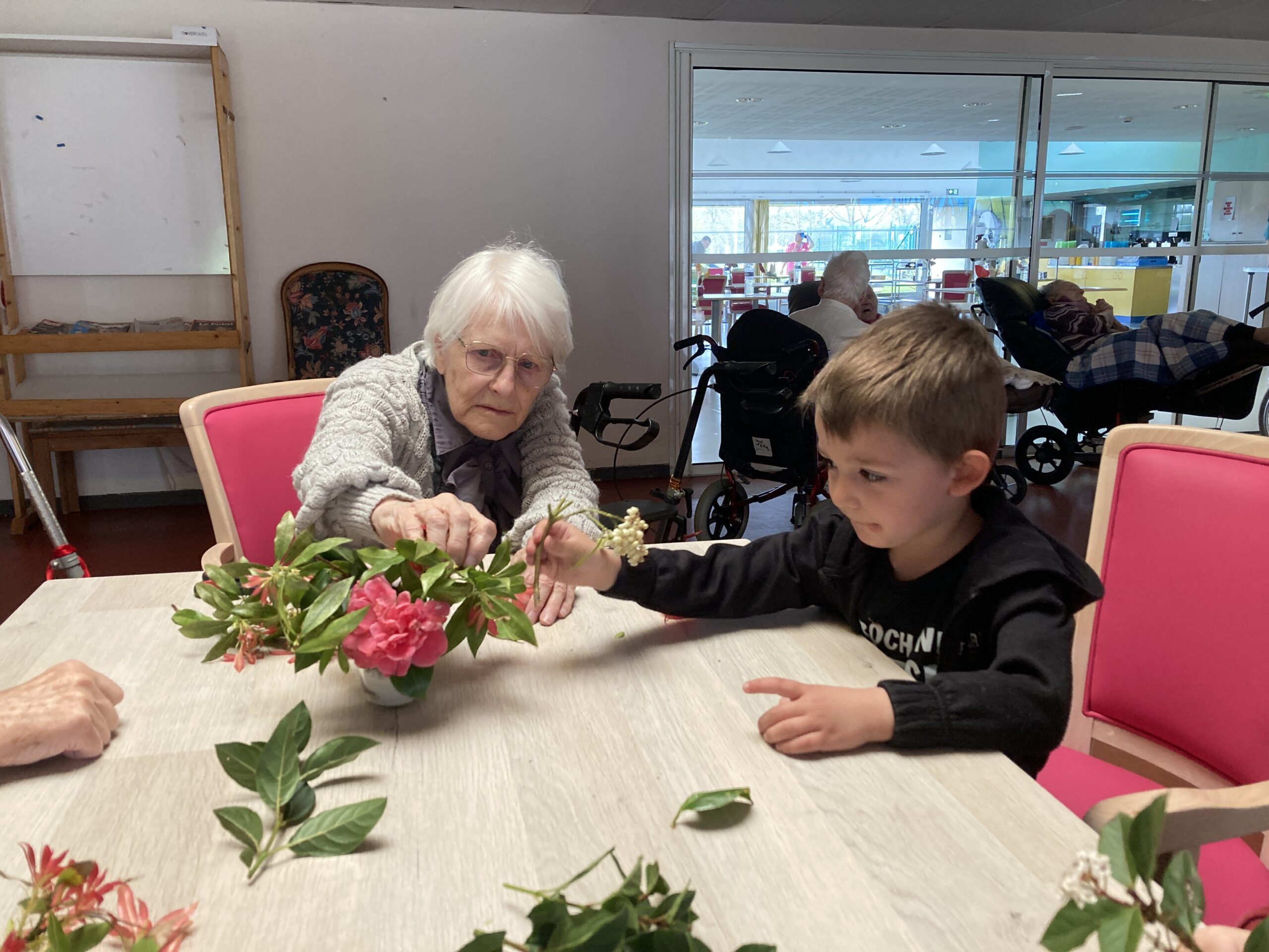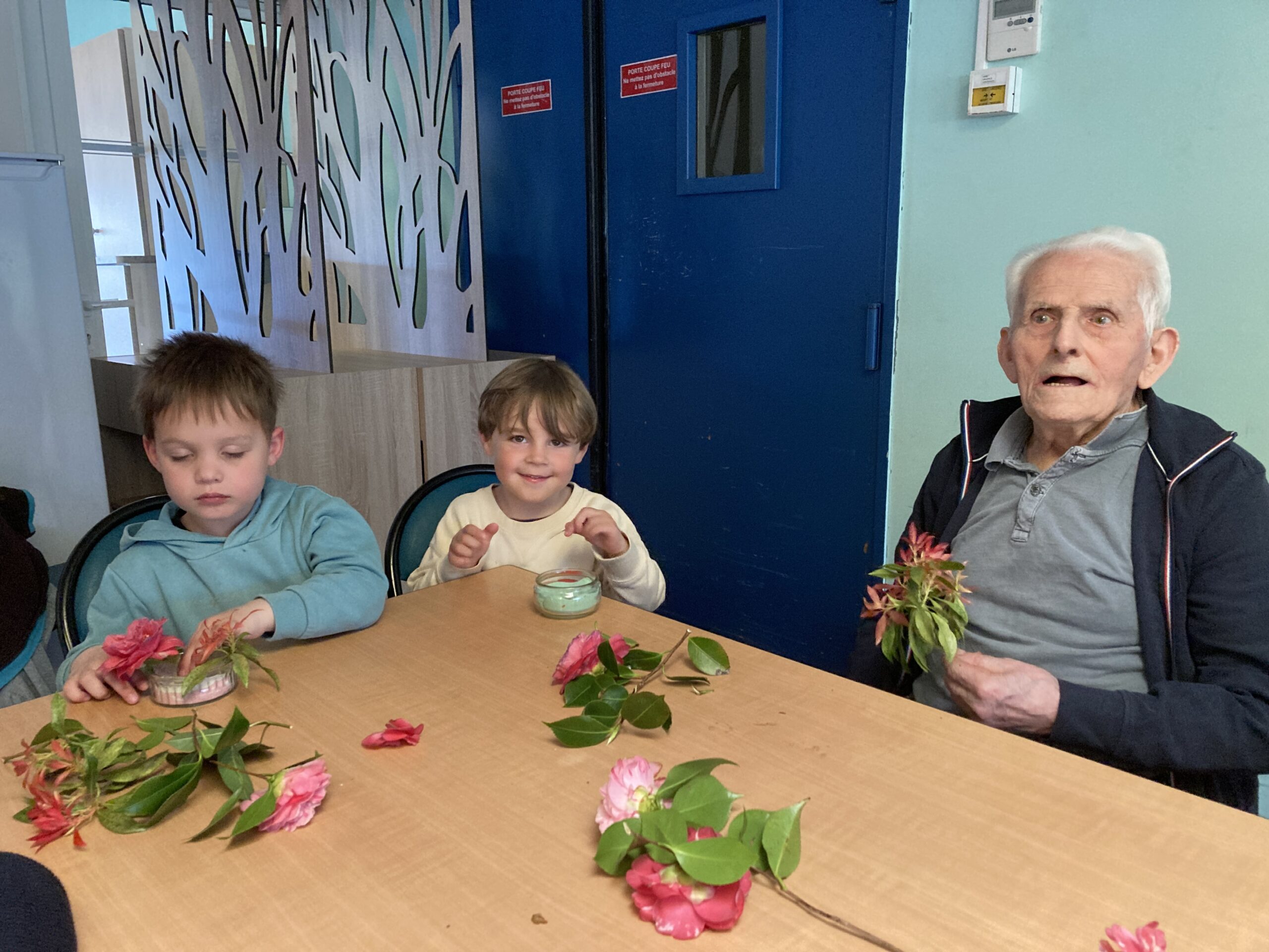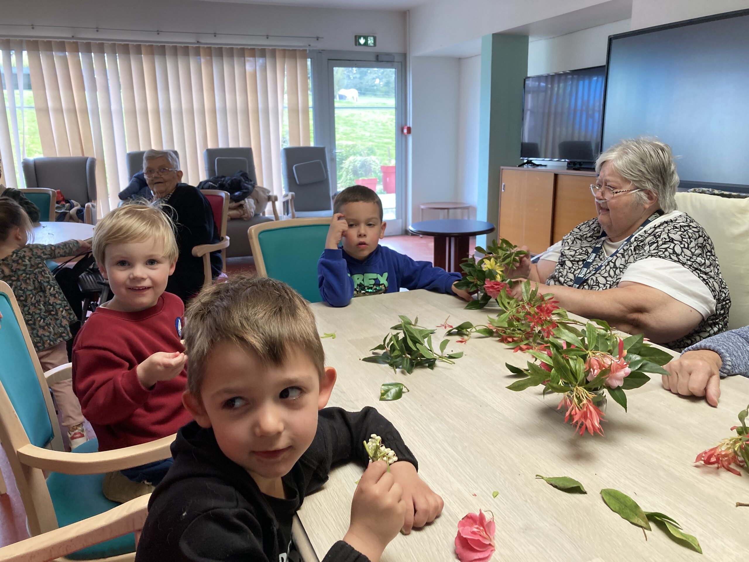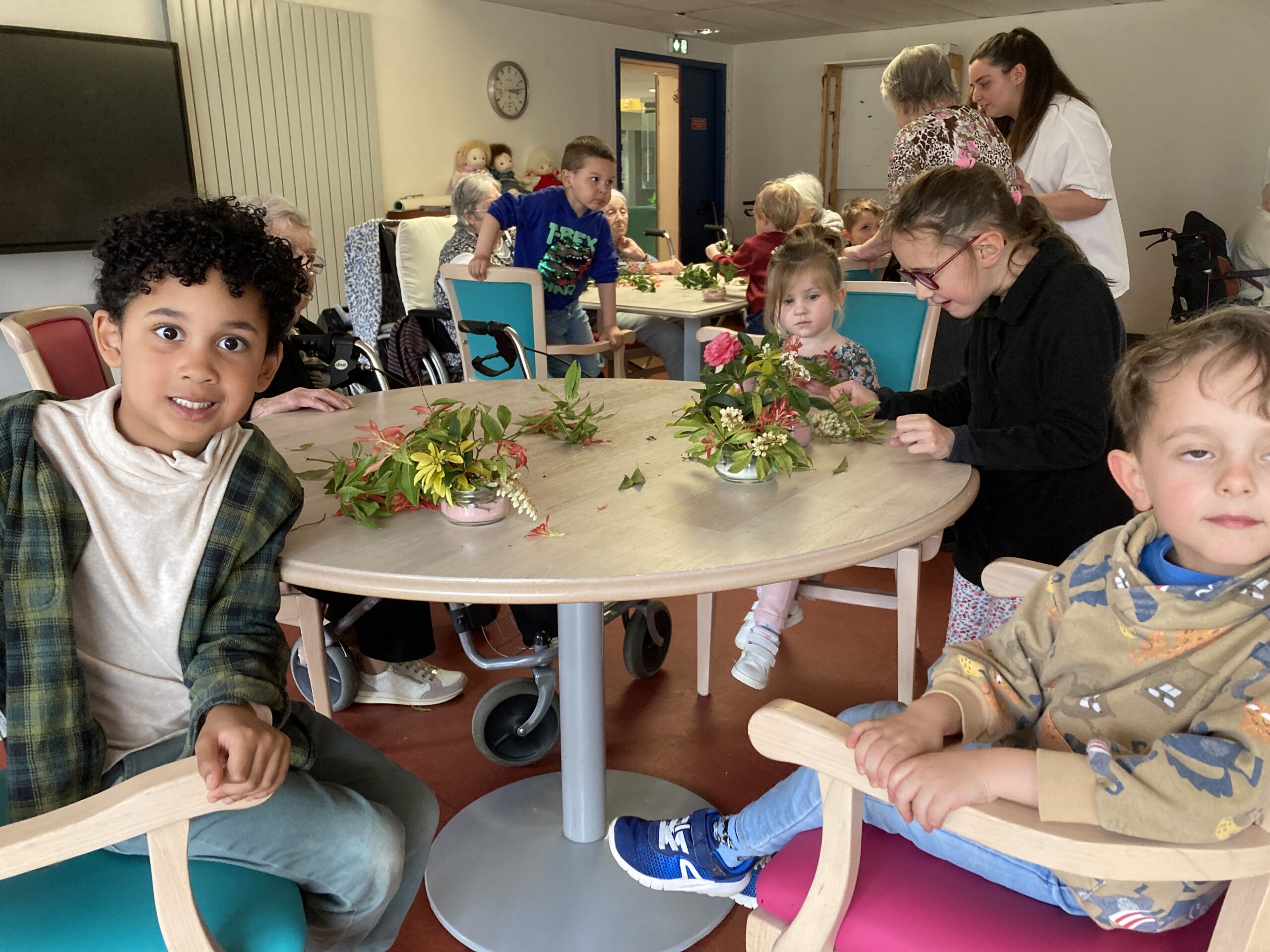 Les enfants de maternelle ont passé un temps à la maison de retraite le jeudi 26 mars dans le cadre du projet intergénérationnel. Un atelier art floral a permis aux enfants de créer du lien avec les personnes de la maison de retraite. Les compositions florales étaient déposées sur les tables pour le repas de la langue de boeuf.