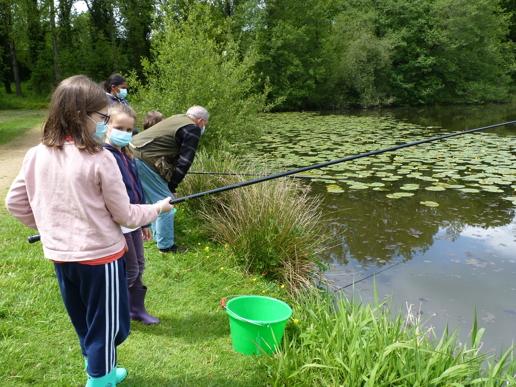 Ce jeudi 27 mai, nous avions rendez-vous sur la rive de l’étang du Château pour une découverte de la pêche. En effet, après un après-midi passé à la découverte du milieu, animé par Antoine Miersman, animateur de la fédération départementale de pêche, nous avons pêché nos premiers poissons. Avant de plonger nos lignes, les enfants ont appris les règles à observer, puis deux par deux, ils ont attendu patiemment de voir frémir le flotteur. La pêche a été fructueuse, mais tous les poissons sont retournés dans l’étang.